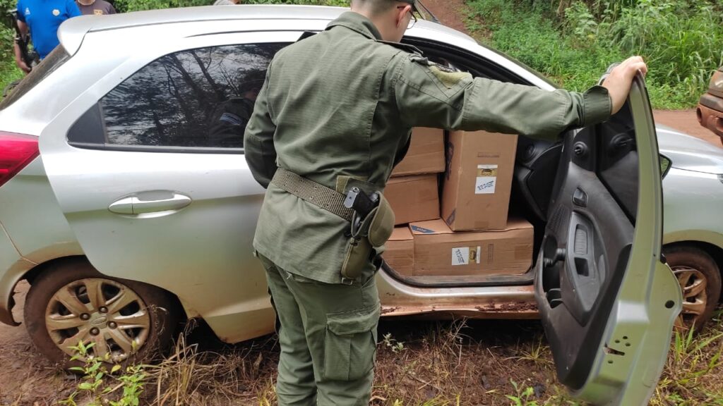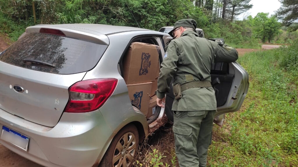 Impedido de continuar, un masculino desciende rodado para adentrarse en la zona montuosa lindante, sin poder lograr su detención. Consecuentemente, y ante la presencia de testigos, se requisó el vehículo, en cuyo interior se observaron gran cantidad de cajas de cigarrillos de origen extranjero, encontrándose en infracción a la Ley de “Código Aduanero”.