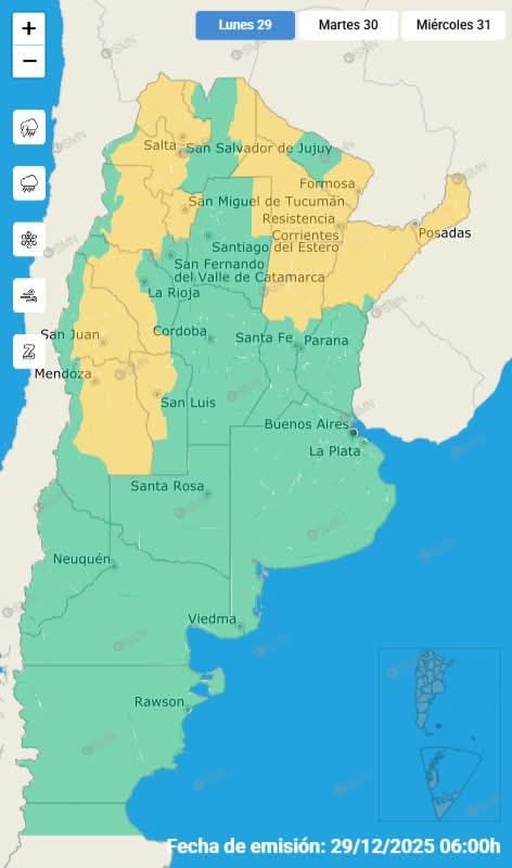 El Servicio Meteorológico Nacional (SMN) emitió una actualización del Sistema de Alerta Temprana para este lunes, con alerta nivel amarillo por tormentas en gran parte del país.