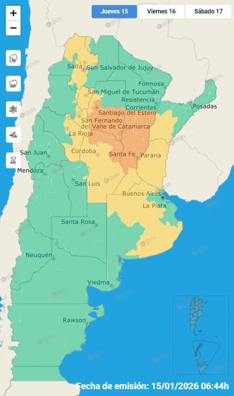 El Servicio Meteorológico Nacional emitió una actualización del Sistema de Alerta Temprana por tormentas que afectará a gran parte del territorio nacional durante este jueves.