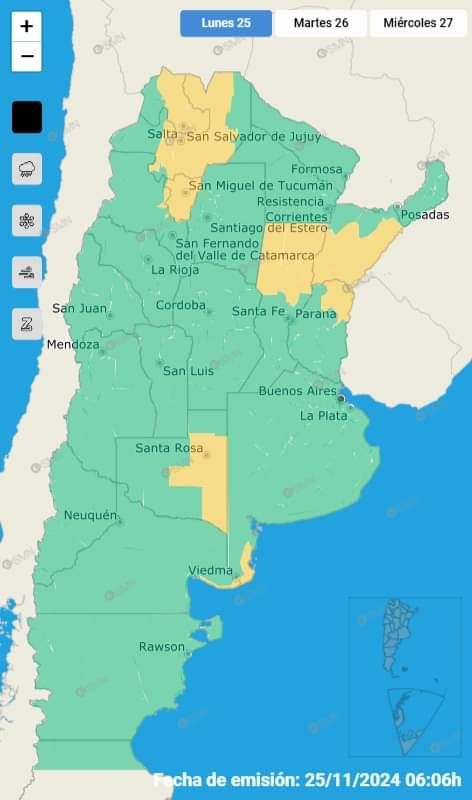 El área del norte de Santa Fe, parte de Corrientes, noreste de Entre Ríos, centro y este de La Pampa, extremo suroeste de Buenos Aires, este y norte de Salta será afectada por tormentas de variada intensidad, algunas localmente fuertes. Las mismas podrán estar acompañadas por abundante caída de agua en cortos periodos, actividad eléctrica frecuente, caída de granizo y ráfagas intensas. Se prevén valores de precipitación acumulada entre 30 y 50 mm, pudiendo ser superados en forma puntual.