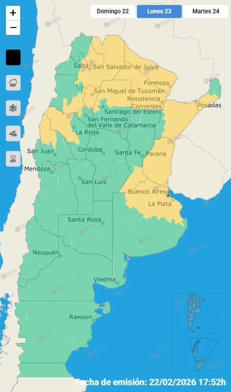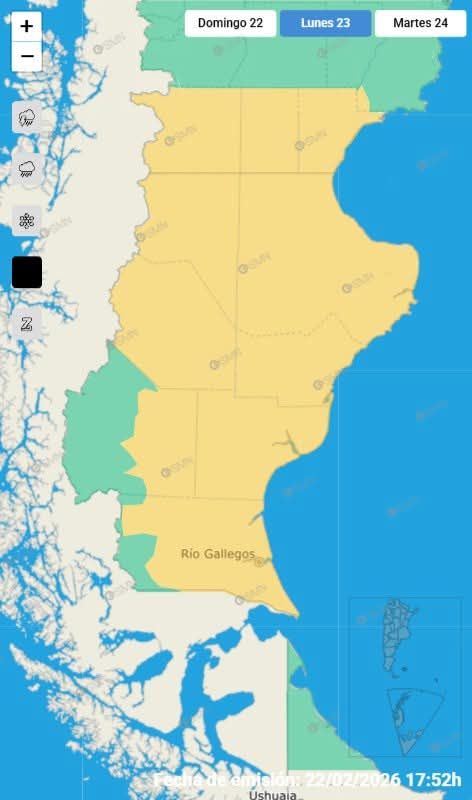 Por otra parte, rige alerta amarilla por viento para gran parte de Santa Cruz y el sur de Chubut. Se anticipan vientos del oeste rotando al sudoeste con velocidades de entre 40 y 65 km/h y ráfagas que podrían superar los 90 km/h.