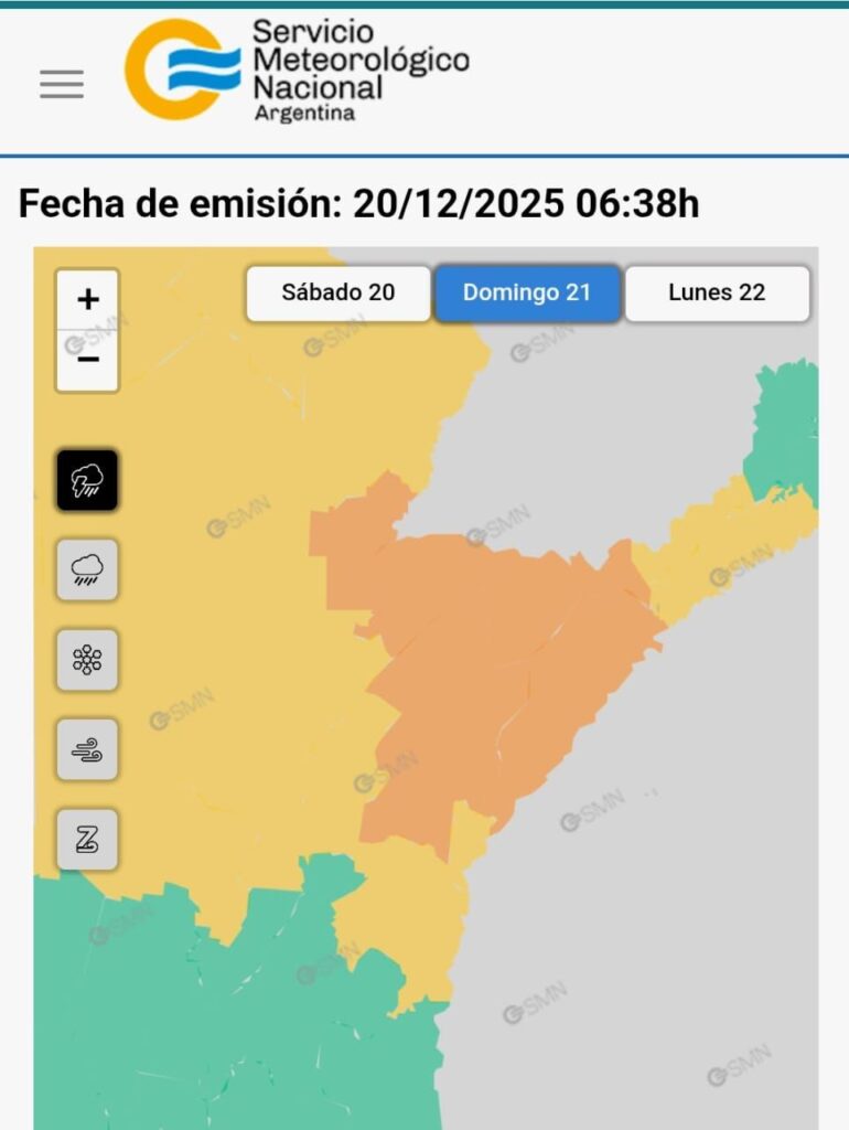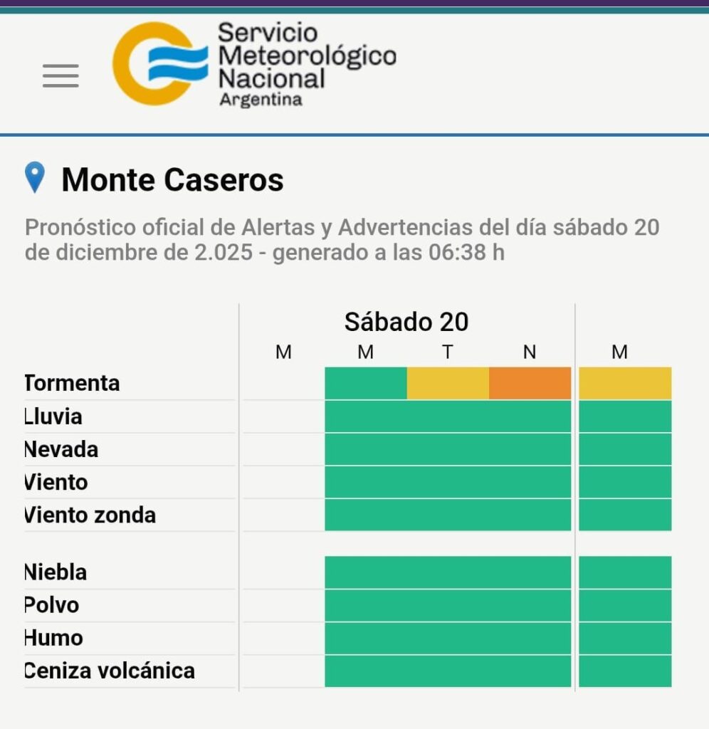 El Servicio Meteorológico Nacional ha emitido un aviso de alerta para este sábado 20 de diciembre, que afecta directamente a la zona de Monte Caseros (AR), y por proximidad geográfica, a las ciudades de Bella Unión (UY) y Barra do Quaraí (BR).