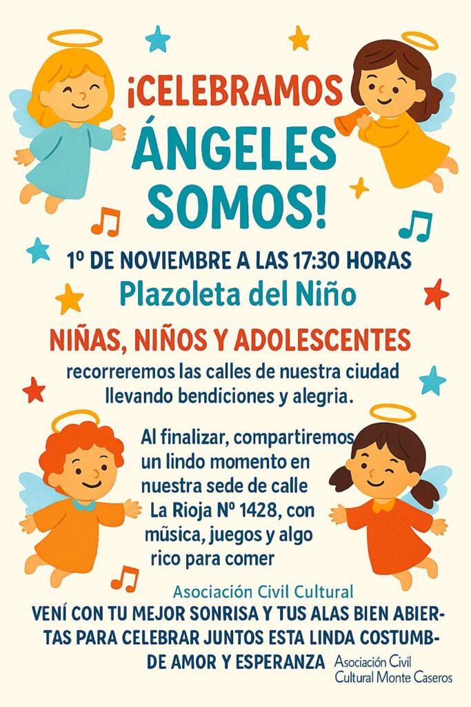 La Asociación Civil Cultural Monte Caseros invita a toda la comunidad a participar de la tradicional celebración “Ángeles Somos”, que se realizará el 1º de noviembre a las 17:30 horas en la Plazoleta del Niño.