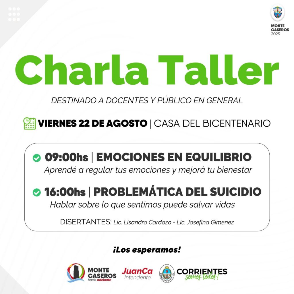 El próximo viernes 22 de agosto se llevará a cabo en la Casa del Bicentenario una Charla Taller destinada a docentes y público en general, con el objetivo de brindar herramientas para el manejo de las emociones y la prevención del suicidio.