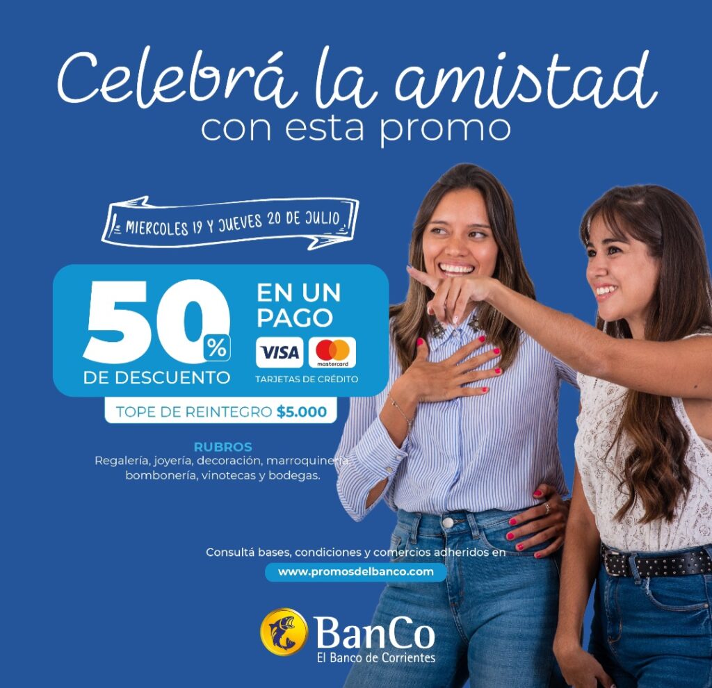 El Banco de Corrientes (BanCo) anunció su promoción especial “Celebremos la amistad”, posibilitando en rubros seleccionados un descuento del 50% en un pago para clientes con tarjetas de crédito Visa y Mastercard, con tope de reintegro de $5.000 por vigencia y por cuenta.