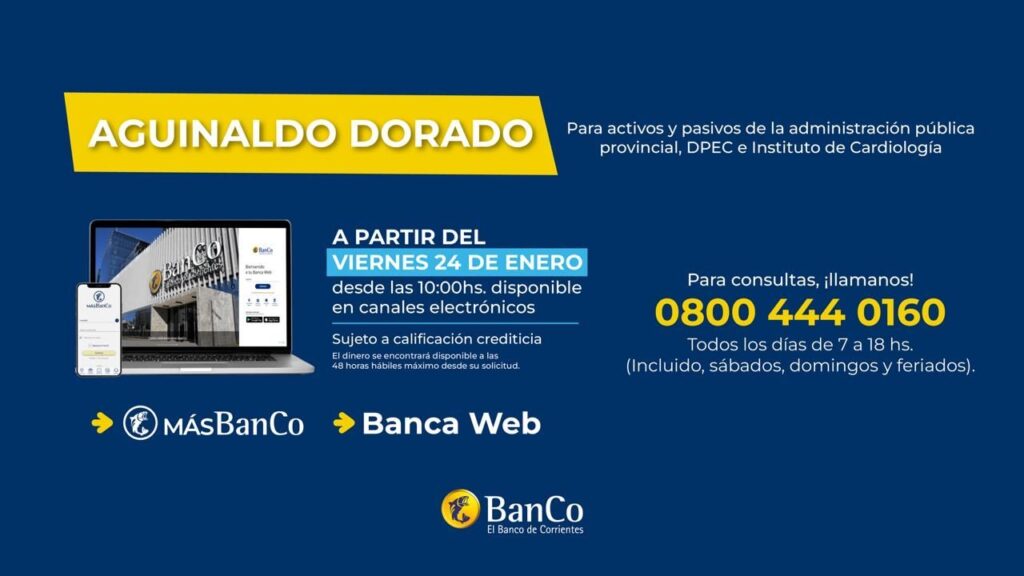 Desde este viernes 24 de enero, está habilitado el anticipo de aguinaldo del Banco de Corrientes (BanCo), correspondiente al Sueldo Anual Complementario (SAC) de junio de 2025. El mismo estará vigente desde las 10 de la mañana de hoy.