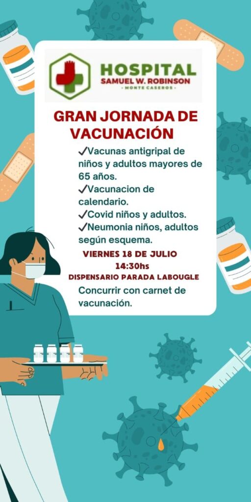 Con el compromiso de acercar la salud, el Hospital Samuel W. Robinson desarrollará este viernes 18 de julio, a partir de las 14:30 hs, una jornada especial de vacunación en el Dispensario de Parada Labougle.