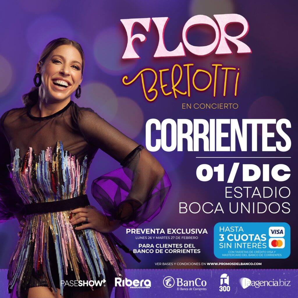 Luego del éxito total en Buenos Aires y agotar 12 Movistar Arena, Florencia Bertotti dará un show en el estadio de Boca Unidos el 1 de diciembre y los clientes del Banco de Corrientes tendrán acceso a una preventa exclusiva. También se lanzó una promoción para la compra de entradas en 3 cuotas sin interés tanto ese show como para el de Lucas Sugo, que se presentará el 9 de marzo en el Cocomarola.