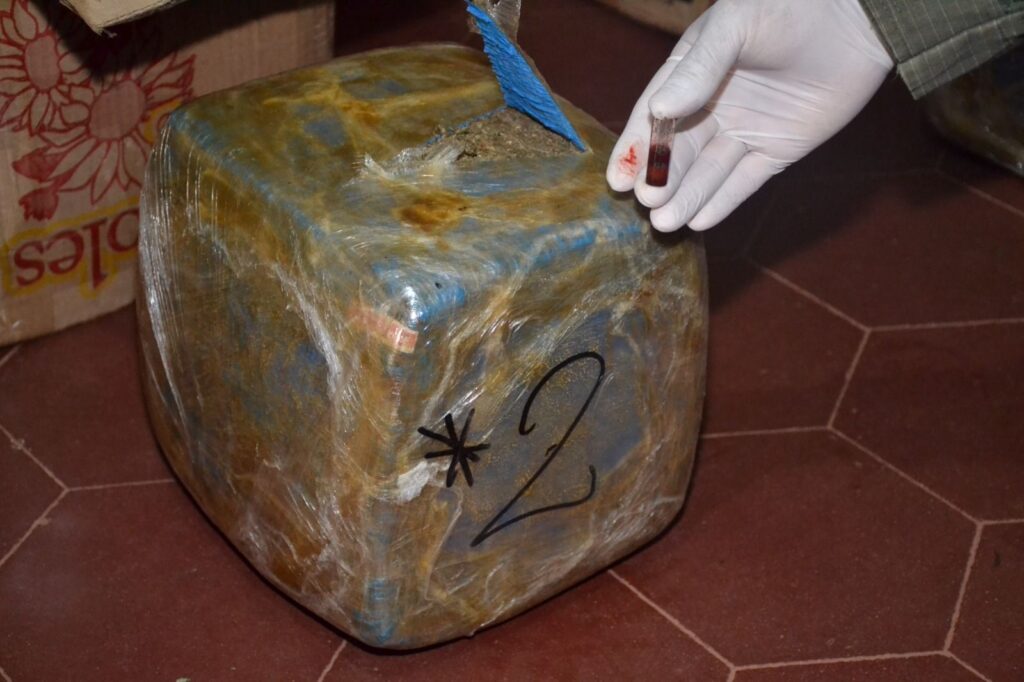 Conforme lo dispuesto por el Magistrado interviniente, y luego de examinar el contenido de los mismos, se constató la presencia de una sustancia vegetal compacta, cuyos análisis arrojaron resultados cromáticamente positivos para “Cannabis Sativa”, con un peso de 18,518 kg.