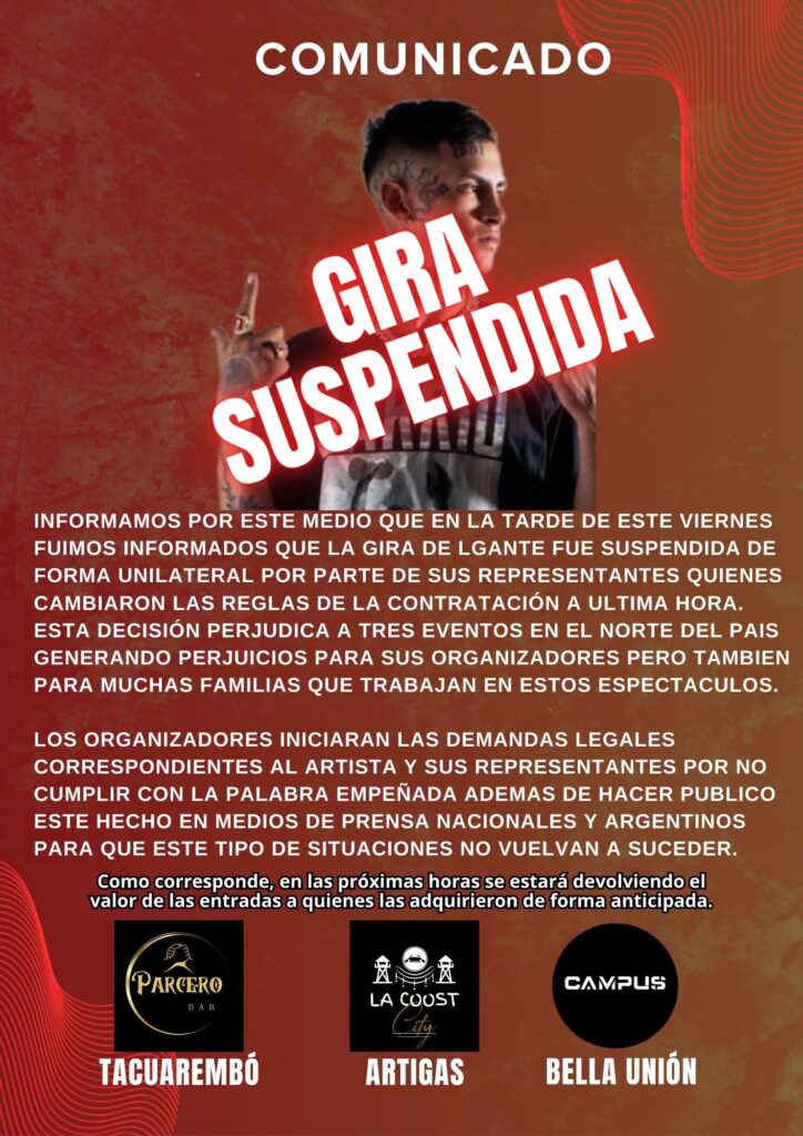 En la tarde del viernes 26 de septiembre, se confirmó la suspensión de la gira que el cantante argentino L-Gante tenía prevista en distintas ciudades de Uruguay, incluyendo Tacuarembó, Bella Unión y Campus.
