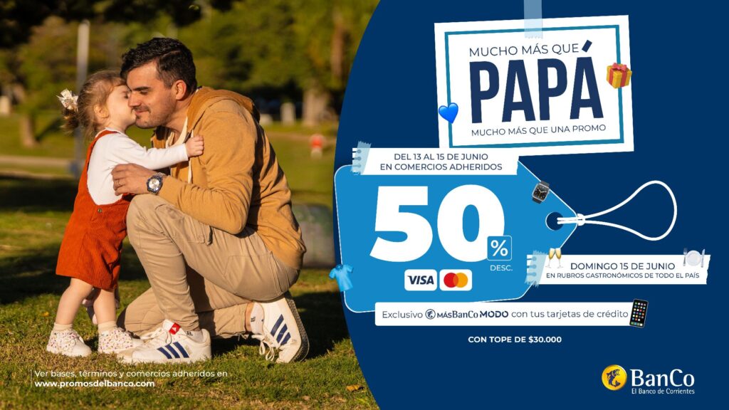 De cara al Día del Padre, el Banco de Corrientes acompaña a sus clientes con una campaña especial bajo el lema “Mucho más que papá, mucho más que una promo”, que ofrece dos promociones con un 50% de descuento en compras con tarjetas de crédito Visa y Mastercard de la Entidad, una destinada a la adquisición de presentes para los padres y otra en rubros gastronómicos. El beneficio tendrá un tope de reintegro de $30.000 y aplicará exclusivamente pagando con QR desde la billetera MÁSBanCo MODO.