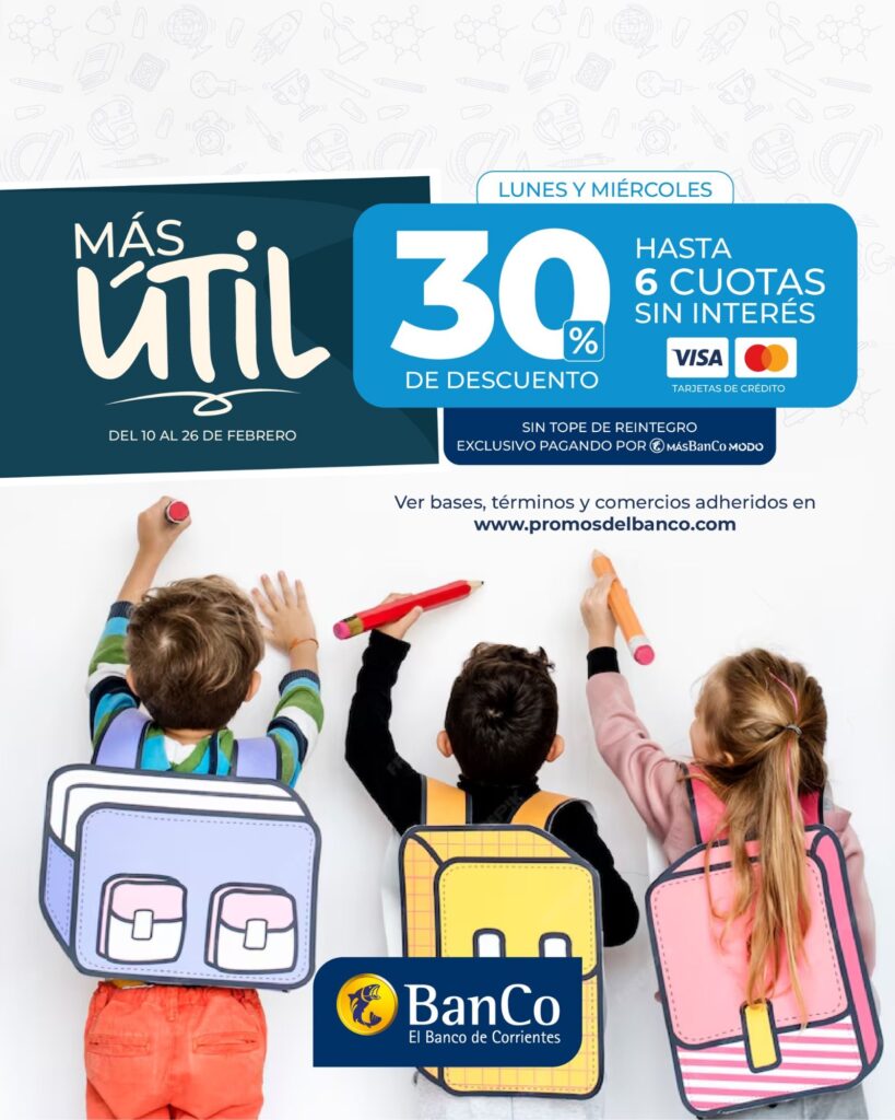 La promoción será los días lunes y miércoles, del 10 al 26 de febrero, y permitirá a los clientes acceder a un descuento de 30% pagando exclusivamente con la billetera MÁSBanCo MODO, y abonando con tarjetas de crédito Visa o Mastercard del BanCo de Corrientes. Además, ofrece un financiamiento de hasta 6 cuotas sin interés. De esta manera, los días 10, 12, 17, 19, 24 y 26 de febrero se podrá hacer uso de esta promoción exclusiva de cara al inicio de clases.