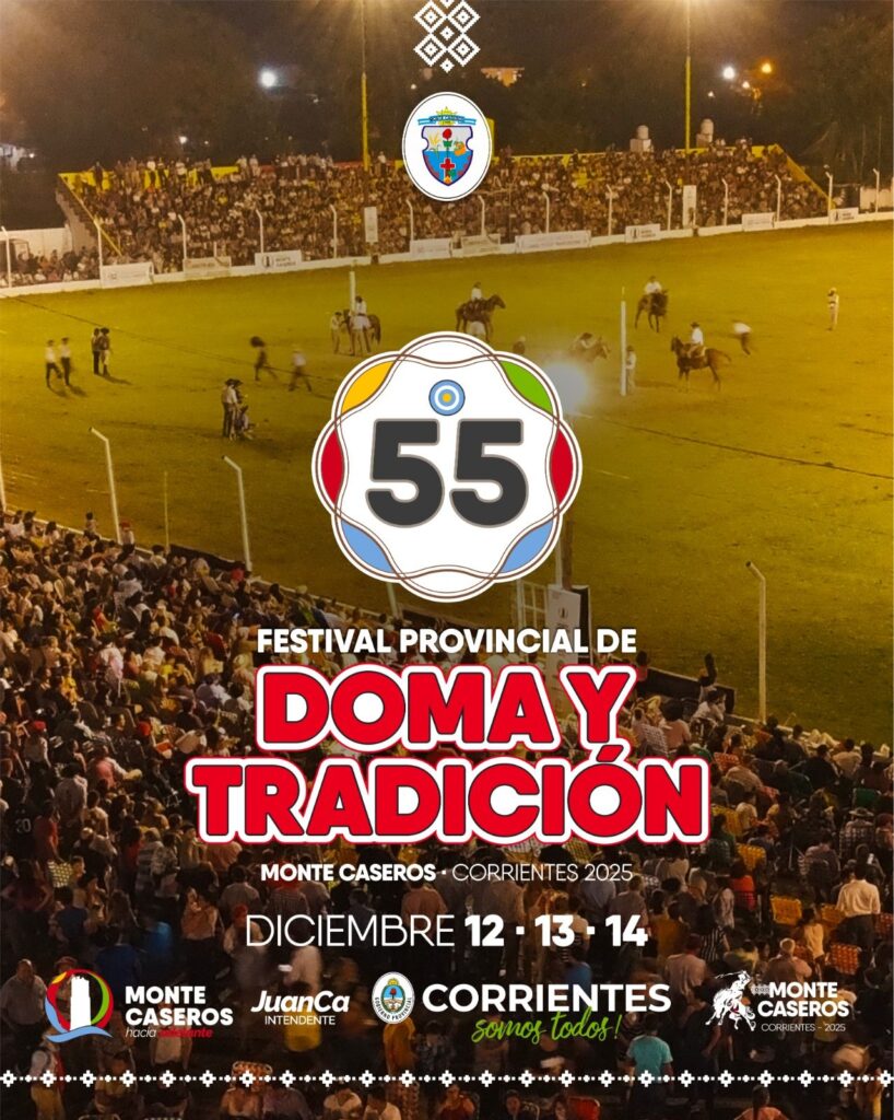 La ciudad de Monte Caseros, en la provincia de Corrientes, será nuevamente sede de una de las celebraciones más importantes del calendario cultural y turístico: el 55° Festival Provincial de Doma y Tradición, que se realizará los días 12, 13 y 14 de diciembre de 2025.