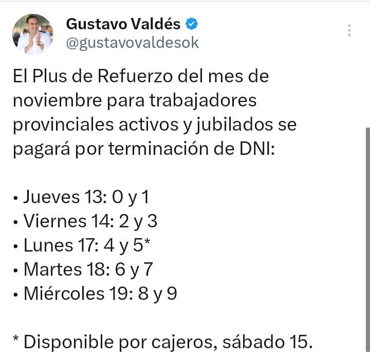 El Gobierno de Corrientes anunció el cronograma de pago del Plus de Refuerzo correspondiente al mes de noviembre para trabajadores provinciales activos y jubilados.