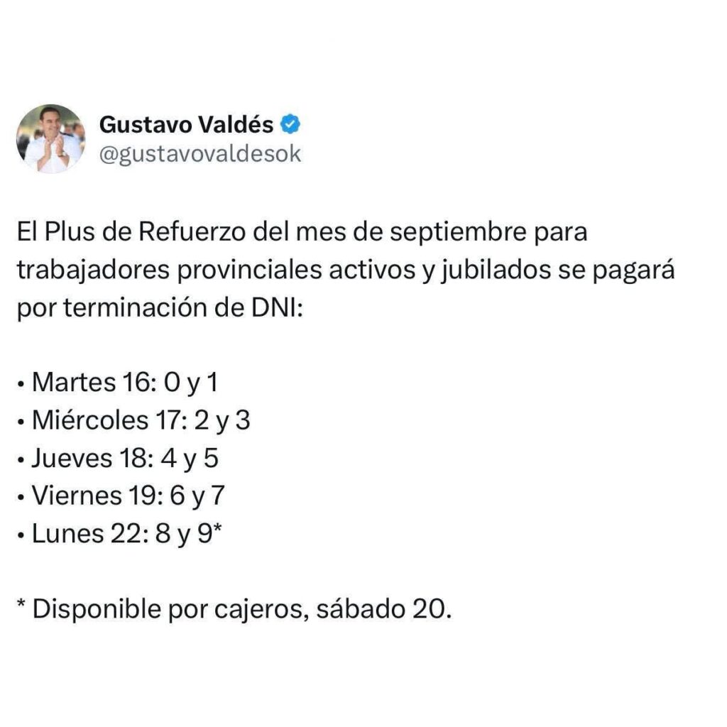 El Gobierno de Corrientes informó el cronograma de pago del Plus de Refuerzo correspondiente al mes de septiembre para trabajadores provinciales activos y jubilados.