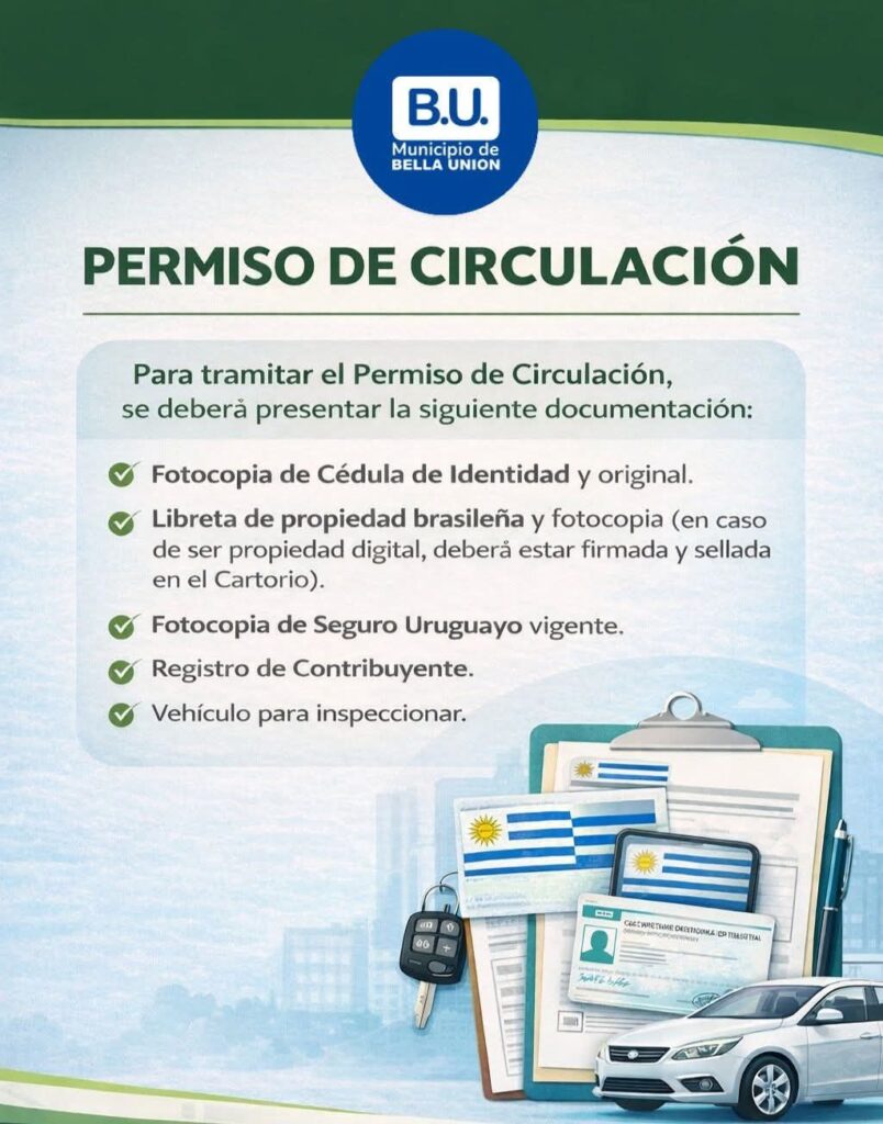 El Municipio de Bella Unión informa a la población los requisitos necesarios para tramitar el Permiso de Circulación.