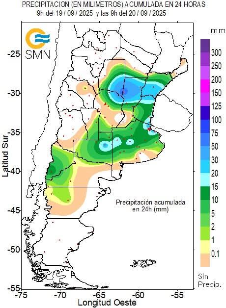 El Servicio Meteorológico Nacional (SMN) informó los valores de lluvia acumulada en las últimas 24 horas, medidos hasta las 9:00 de hoy, sábado 20 de septiembre.