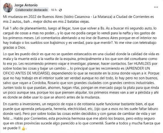“Leí comentarios diciendo que en el interior no hay trabajo o que los sueldos son bajísimos, y es verdad, ¿para qué mentir?”, reconoció. Pero aclaró que en su caso pudo dar el paso porque ya contaba con teletrabajo. También dejó un consejo fundamental para quienes estén pensando en mudarse: “Aprendan un oficio antes de irse”.