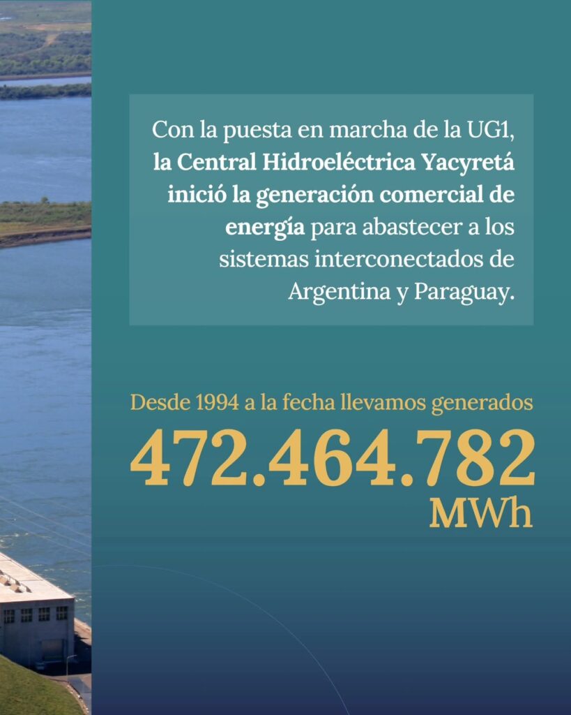 El 2 de septiembre de 1994 marcó un hito histórico para la región: la entrada en operación de la Unidad Generadora Nº 1 (UG1) de Yacyretá, que dio inicio a la generación comercial de energía en la represa binacional.